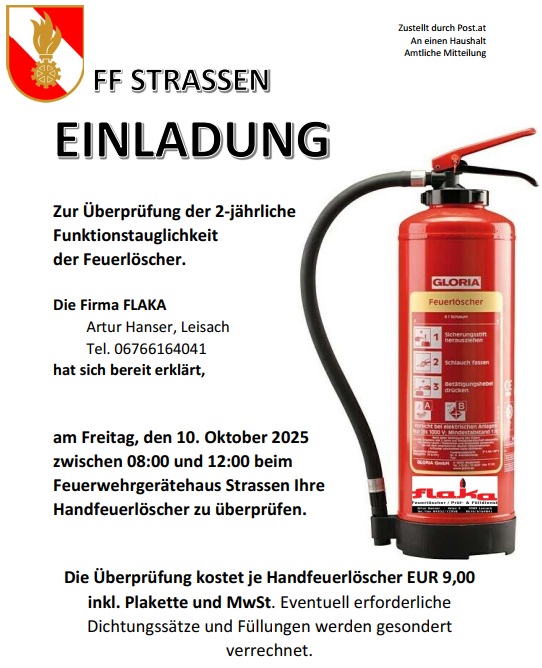 Die Freiwillige Feuerwehr Strassen lädt alle Bürgerinnen und Bürger herzlich zur diesjährigen Feuerlöscherüberprüfung ein.